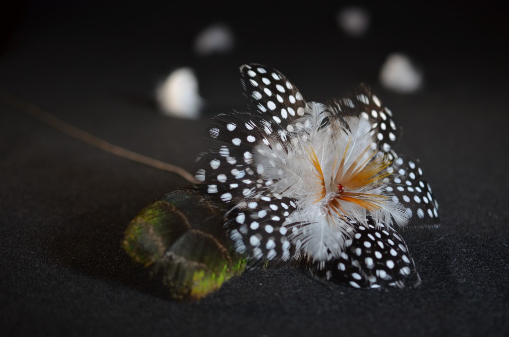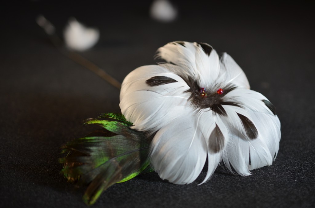 Chaque fleur est composée de plumes qui sont fixées une à une, attachée pour ensuite être collé. Le temps de réalisation d'une fleur est d'environ 1 à 2 heures, selon la quantité et la variété de plumes employés. Au gré de ma fantaisie, j'ajoute parfois des perles, du cuir ainsi que d'autres fournitures.